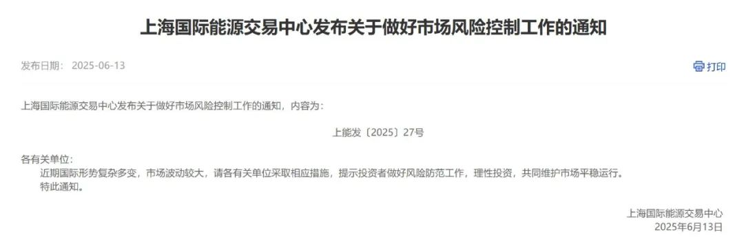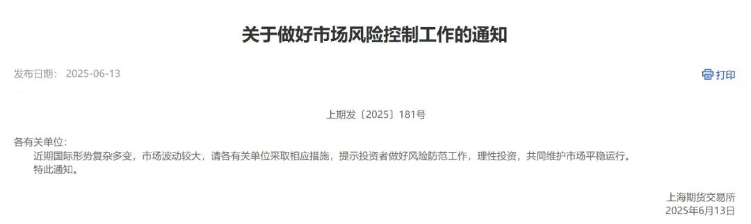 昨日,上期所和上期能源发布通知:近期国际形势复杂多变,市场波动较大,请各有关单位采取相应措施,提示投资者做好风险防范工作,理性投资,共同维护市场平稳运行。
