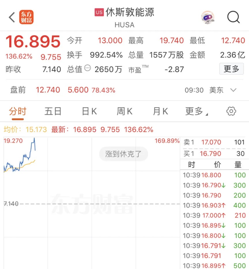 当地时间6月13日,美股三大股指全线低开,能源股逆势走强,休斯敦能源一度熔断,涨幅一度超160%;美国能源一度涨超90%。