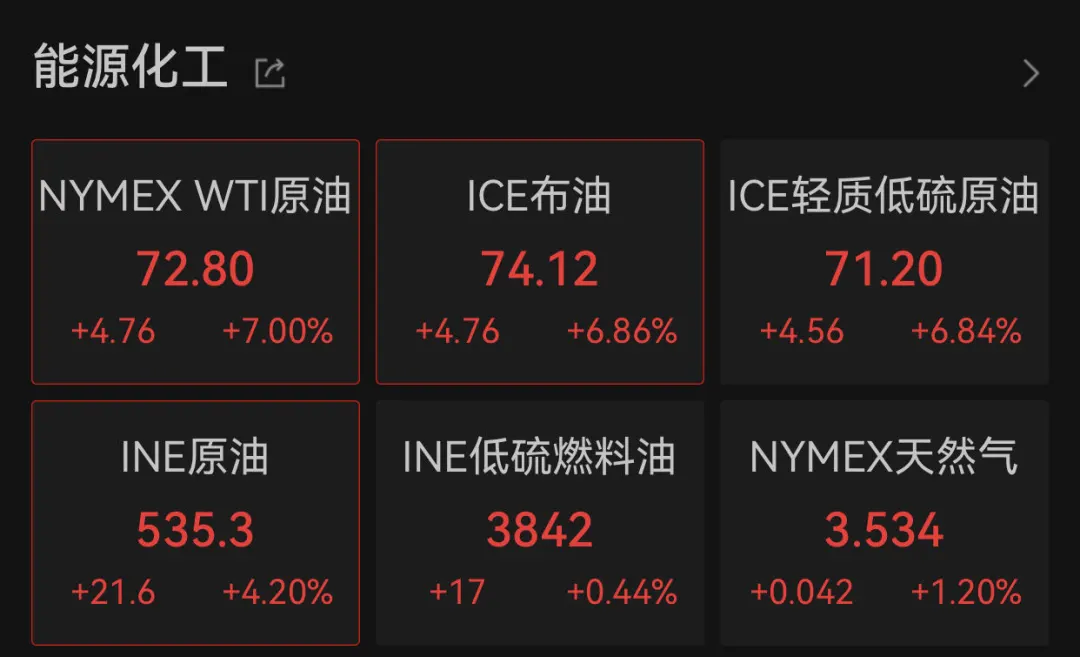 截至今晨收盘,WTI原油期货涨7.55%,报73.18美元/桶,本周涨13.32%;布伦特原油期货涨7.5%,报74.56美元/桶,本周涨12.17%。